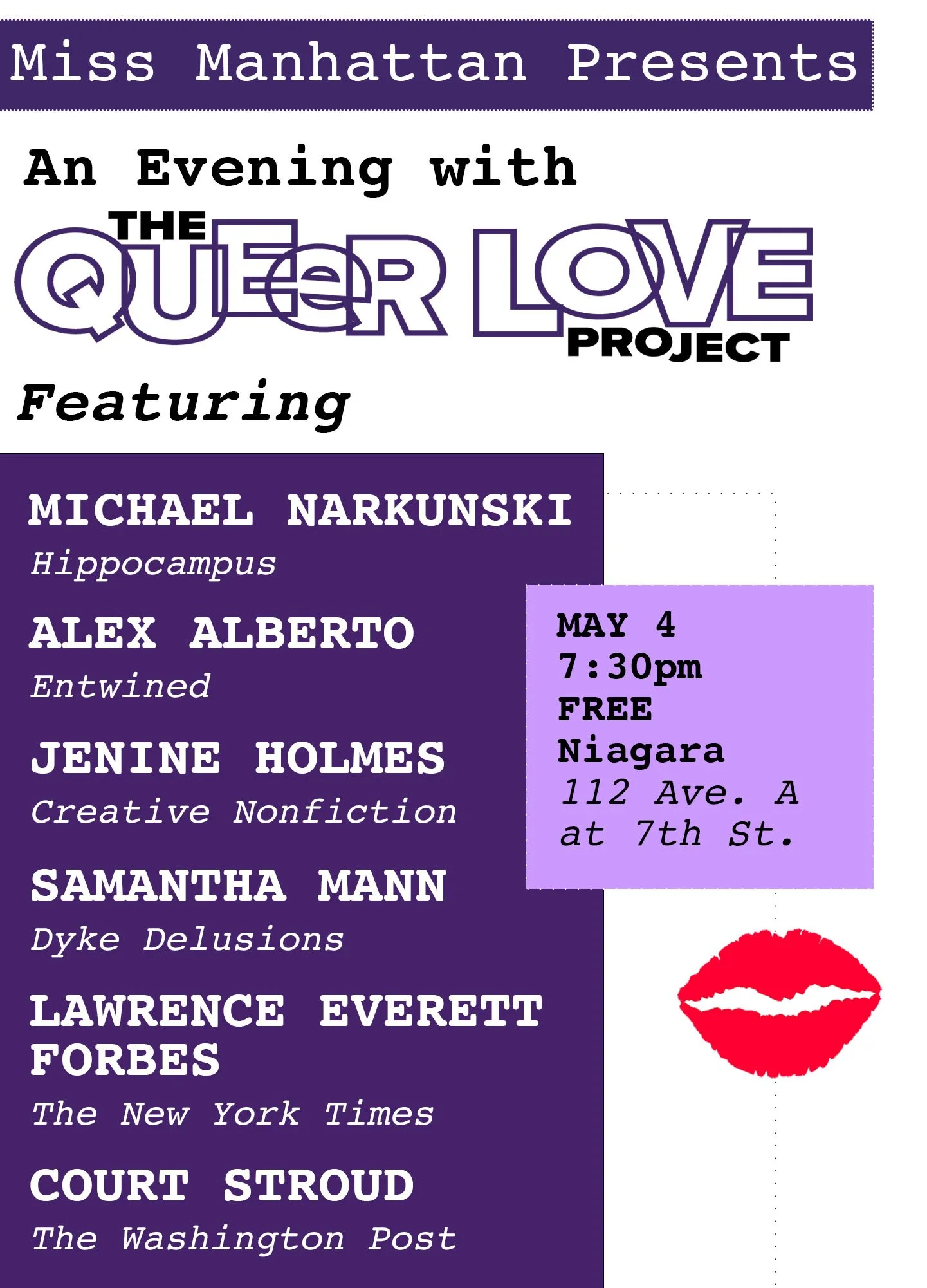 The next Miss Manhattan Non-Fiction Reading will be on Monday, May 4 at Niagara (112 Avenue A at 7th Street) at 7:30pm, and it is our 2nd Annual collaboration with The Queer Love Project, curated by QLP co-founder Jerry Portwood!